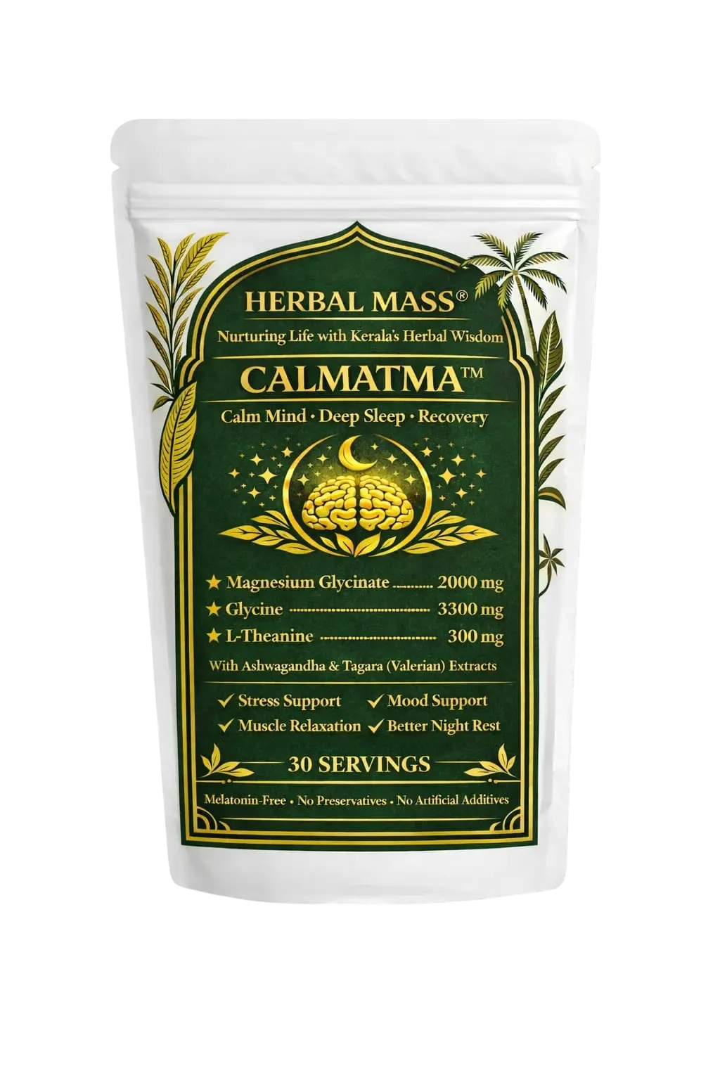 Melatonin-Free relaxation formula combining Magnesium Glycinate, Glycine, L-Theanine, Ashwagandha and Tagara.
